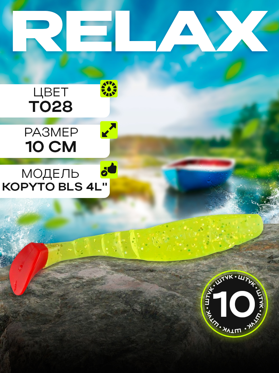 Виброхвосты Relax Kopyto BLS 4L" 10см цвет T028 (желтый, красный,с блестками) (10шт) (BLS4L)