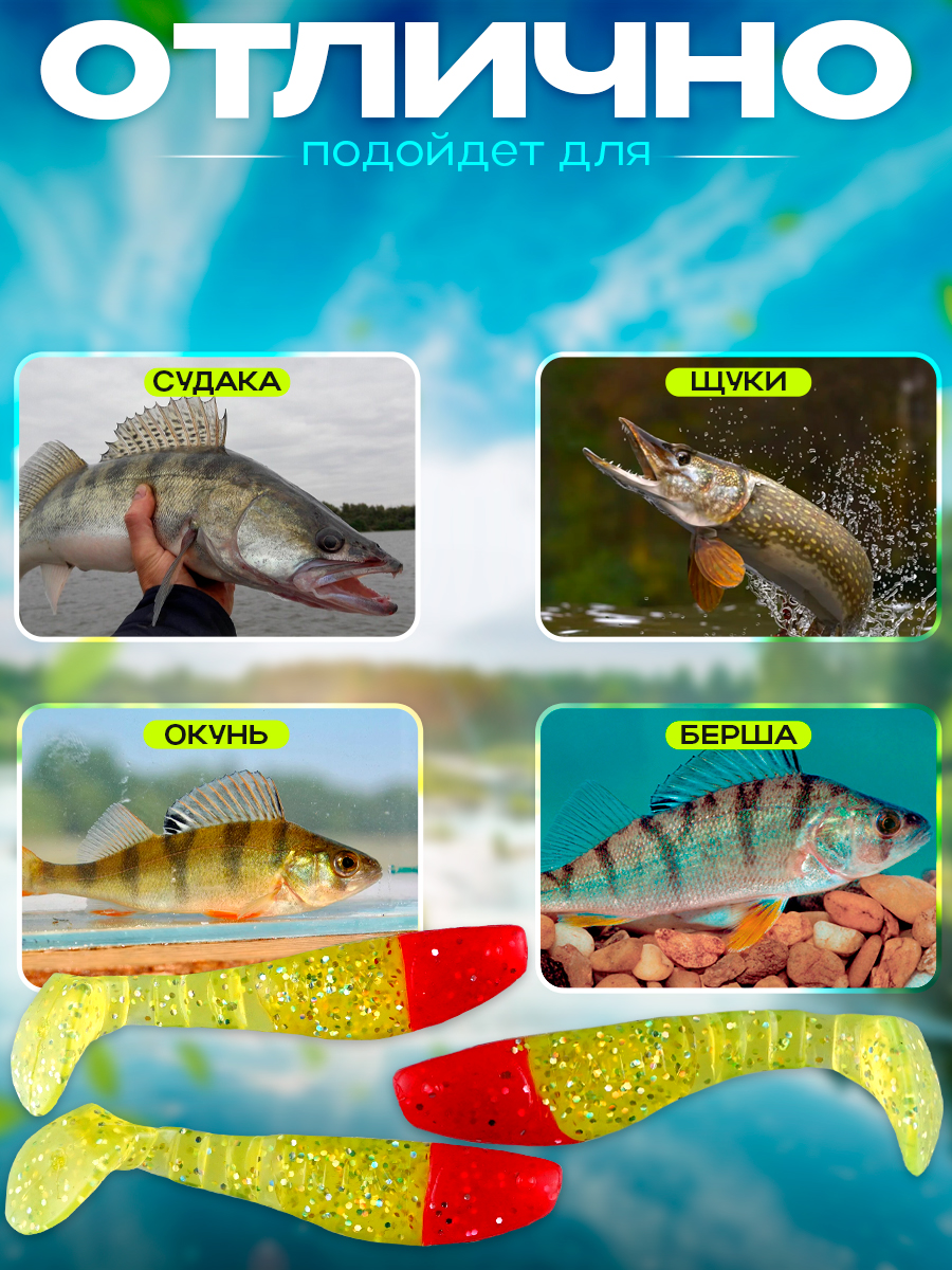 Виброхвосты Relax Kopyto BLS Heads 3" 7,5см цвет H025 (желтый, красный, прозрачный, с блестками) (10шт) (BLS3)