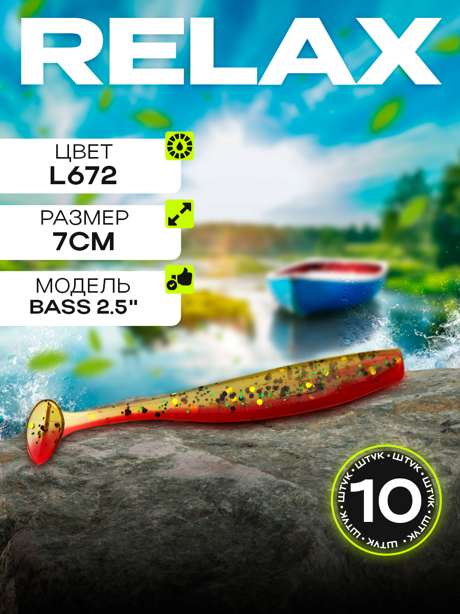 Виброхвосты Relax Bass 2.5" 7см цвет L672 (красный, машинное масло, с блестками) (10шт) (BAS25)