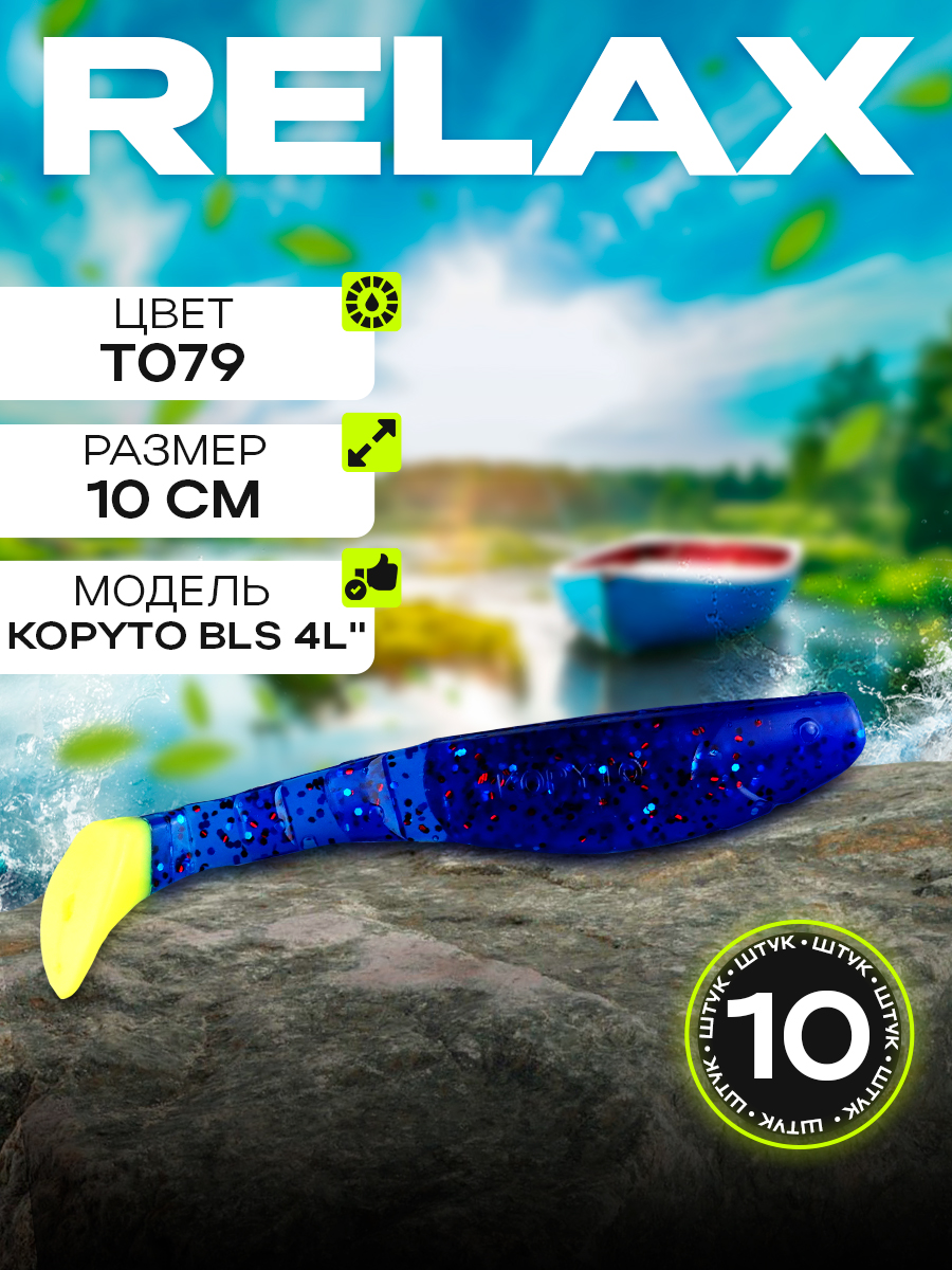 Виброхвосты Relax Kopyto BLS 4L" 10см цвет T079 (синий, желтый, красные блестки) (10шт) (BLS4L)