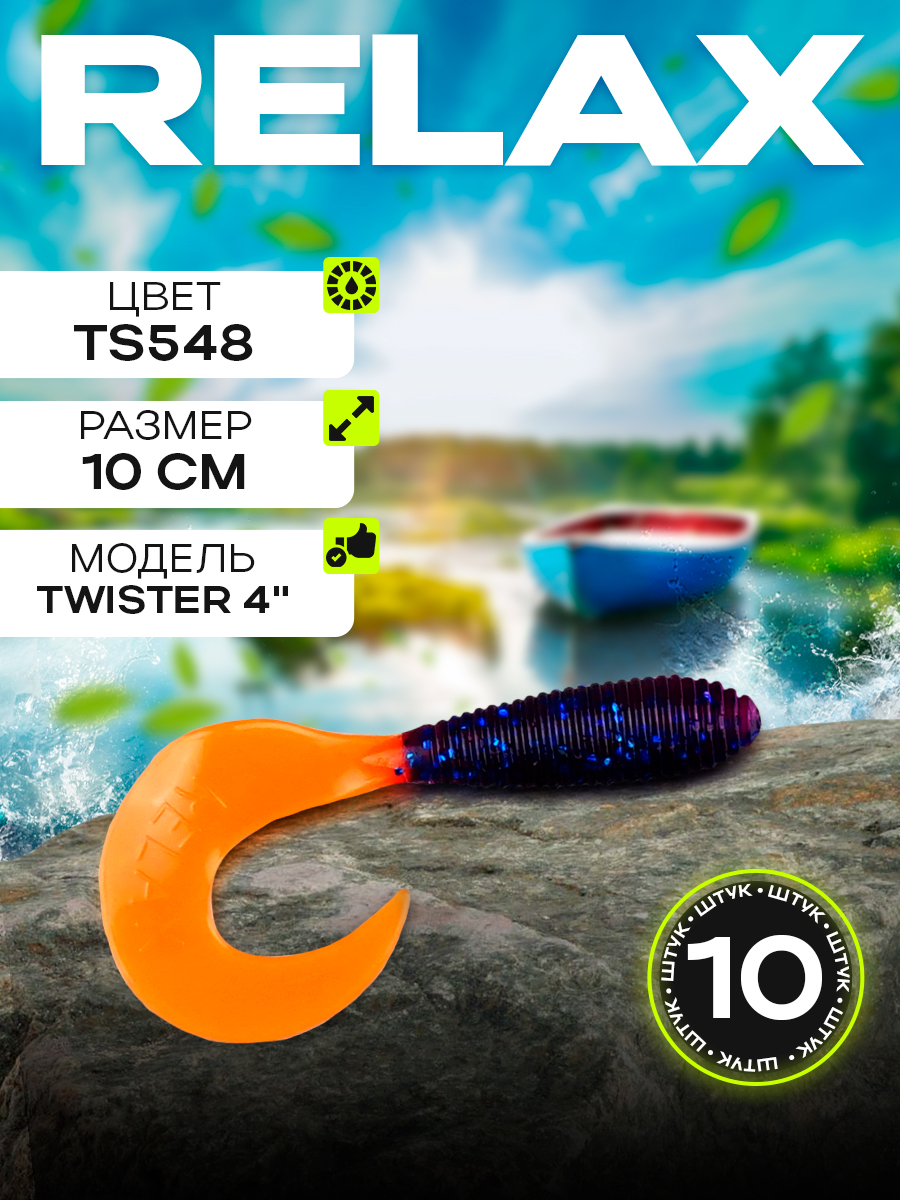 Твистеры Relax 4" 10см цвет TS548 (фиолетовый, оранжевый, синие блестки) (10шт) (VR4)