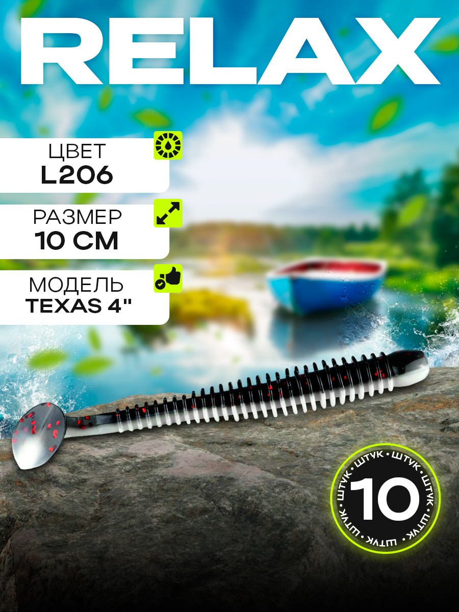 Виброхвосты Relax Texas 4" 10см цвет L206 (белый, черный, красные блестки) (10шт) (TX4)