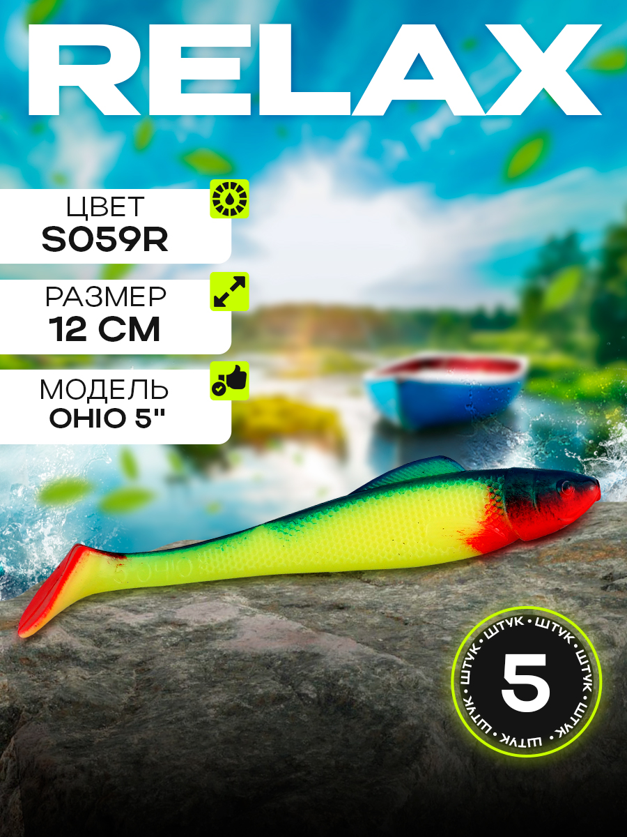 Виброхвосты Relax Ohio 5" 12см цвет S059R (желтый, зеленый, черный, красный) (5шт) (OH5)