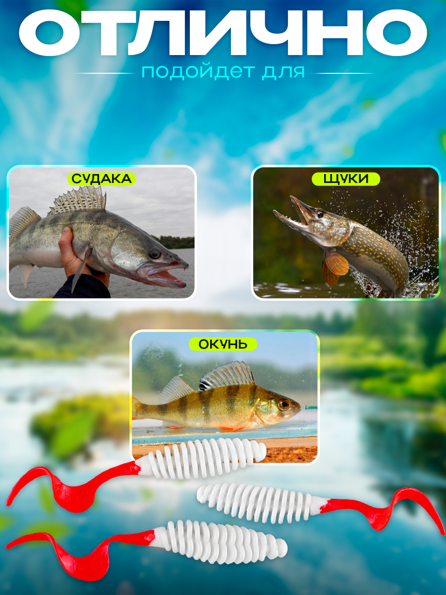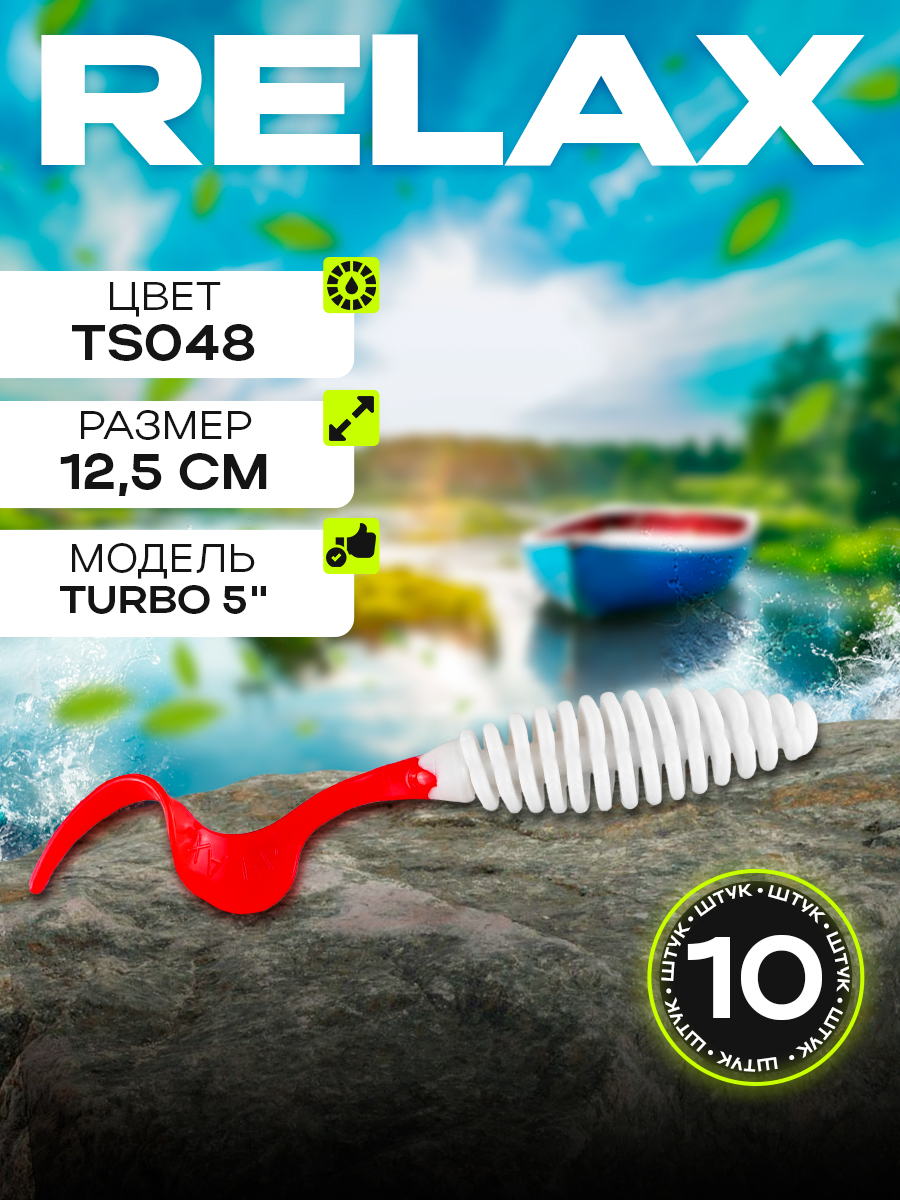 Turbo 5" - крупный твистер от американской фирмы Relax. Эта приманка примечательна тем, что имеет объемные "ребра" по всей длине туловища. Они визуально увеличивают ее и делают более заметной при проводке за счет гидроакустического эффекта. Также приманка имеет подвижный хвост, свойственный всем твистерам. Он затейливо играет на проводке, привлекая внимание хищника. Приманка рассчитана на ловлю щуки, но привлечет и крупного окуня или судака. Она хорошо работает как в пластических джиговых монтажах, так и в поводковых оснастках. Также на Turbo 5" можно ловить в неогруженном виде.