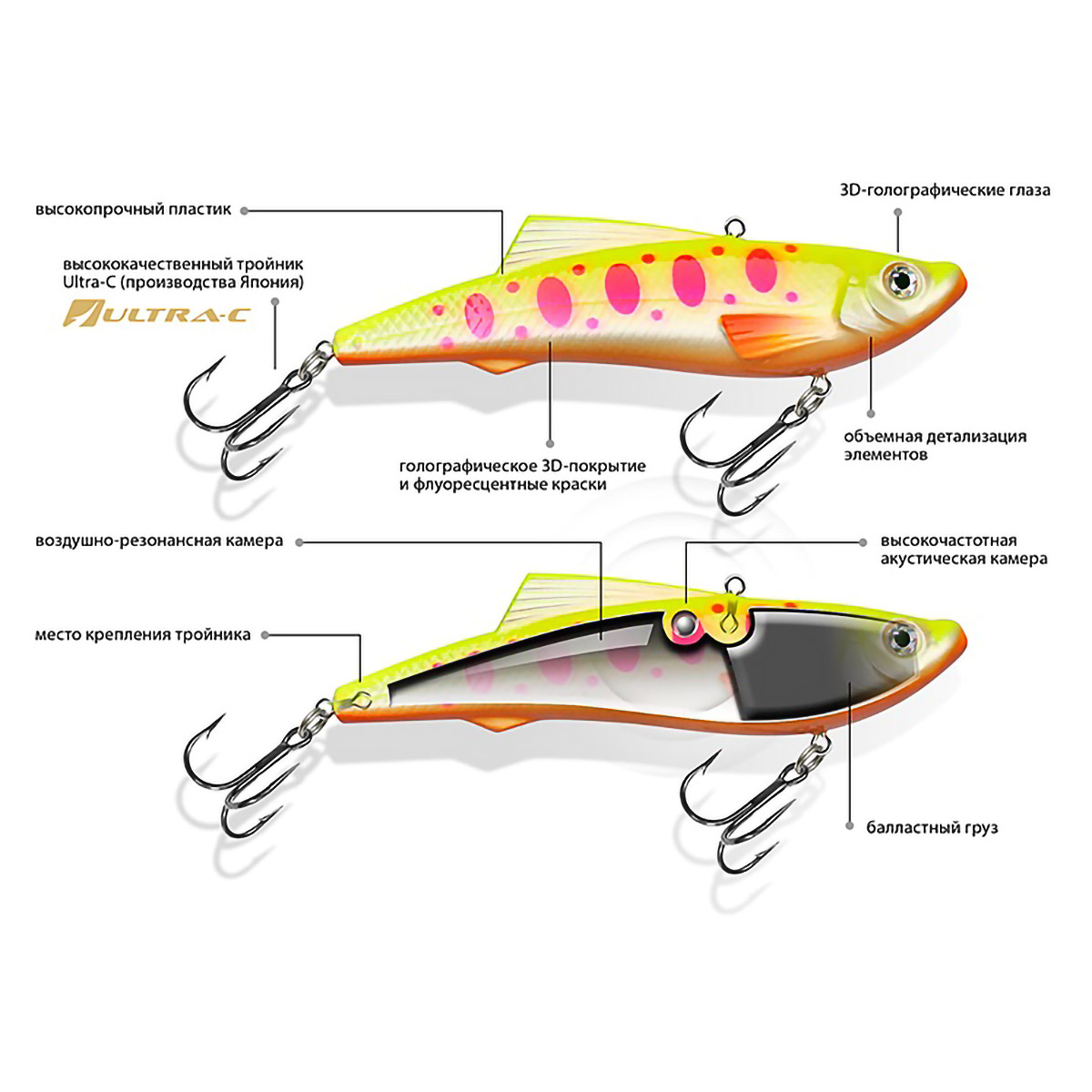 Высокочастотная акустическая камера, создают дополнительный гидроакустический эффект, привлекающий затаившуюся рыбу со значительных расстояний (до 26m).