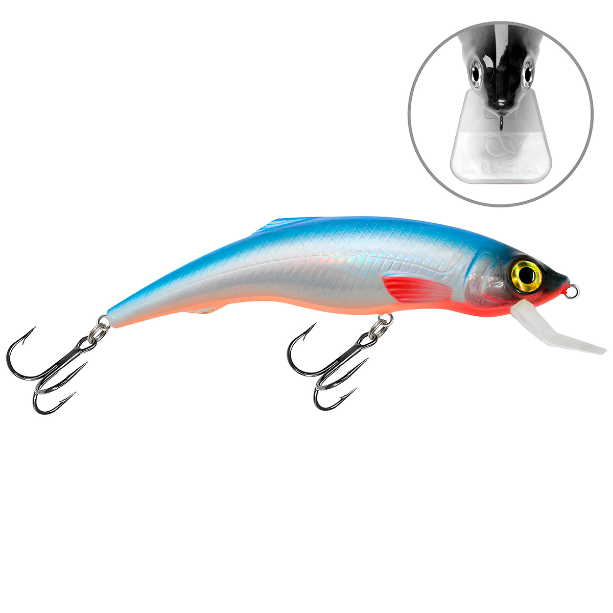 Корпус воблера и заглубляющая лопасть (язычок) изготовлены из ударопрочного пластика неподвластного зубам хищной рыбы и выдерживающая удары о донные камни при проводке.