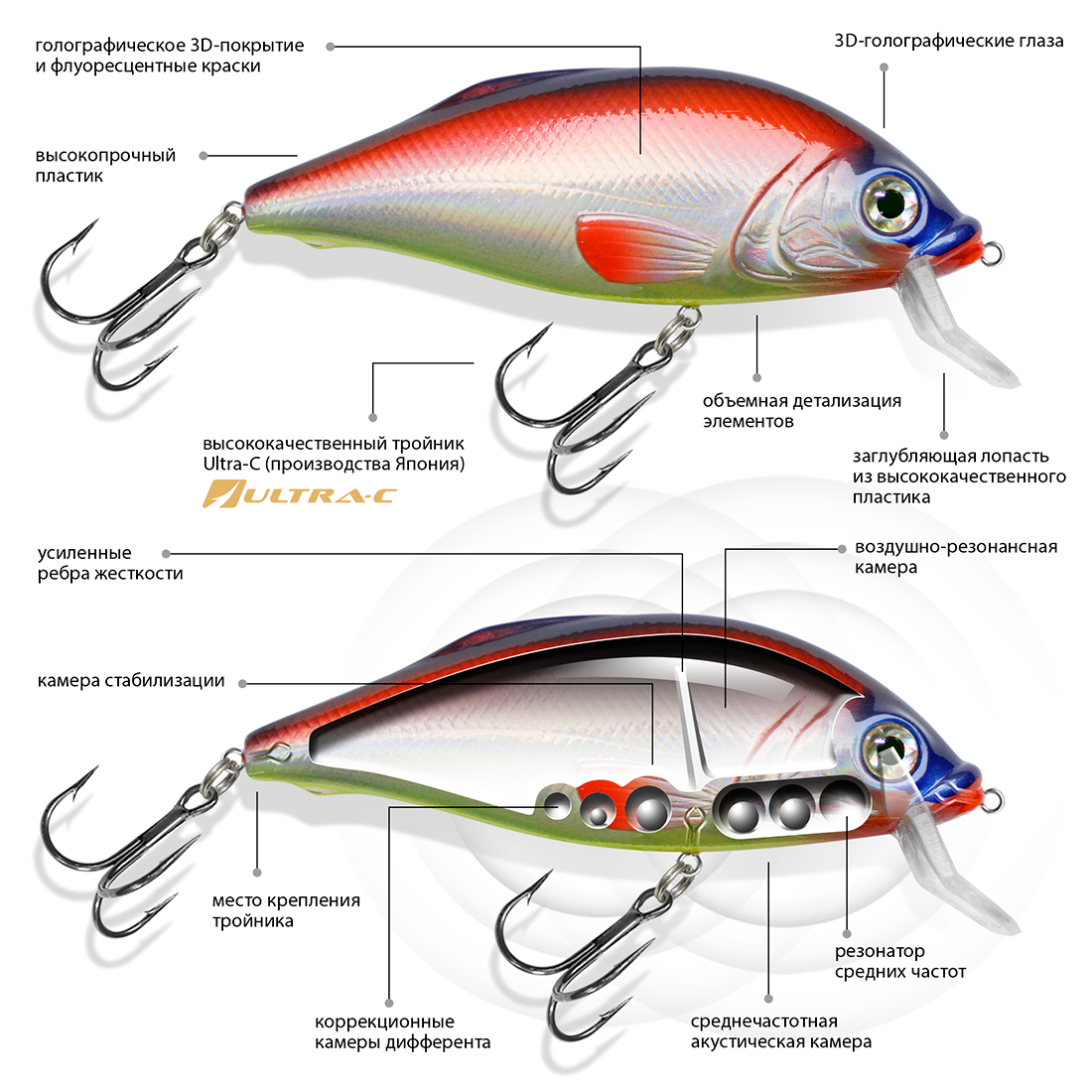 Ключевым отличием версии воблера МШ (малошумный) является уменьшенный акустический эффект – что актуально при ловле пассивной рыбы на «запрессованных» водоемах, так как наиболее популярными в народе являются активные приманки с ярко выраженным шумовым эффектом и зачастую они не привлекают рыбу, а наоборот отпугивают.