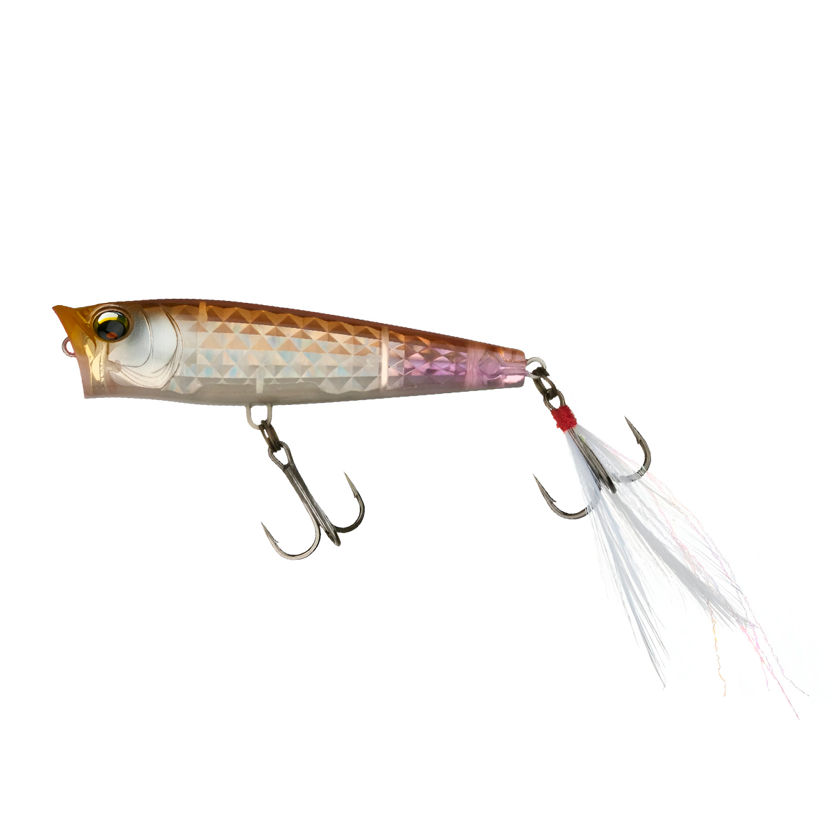 Корпус с шумовой камерой и оперённым хвостовым тройником добавляет привлекательности при паузах; модель демонстрирует высокую дальнобойность, оставаясь стабильной на рывках. Поверхностная рабочая глубина 0–0,1 м позволяет облавливать мелководья и «ковры» растительности, где тонущие воблеры пасуют