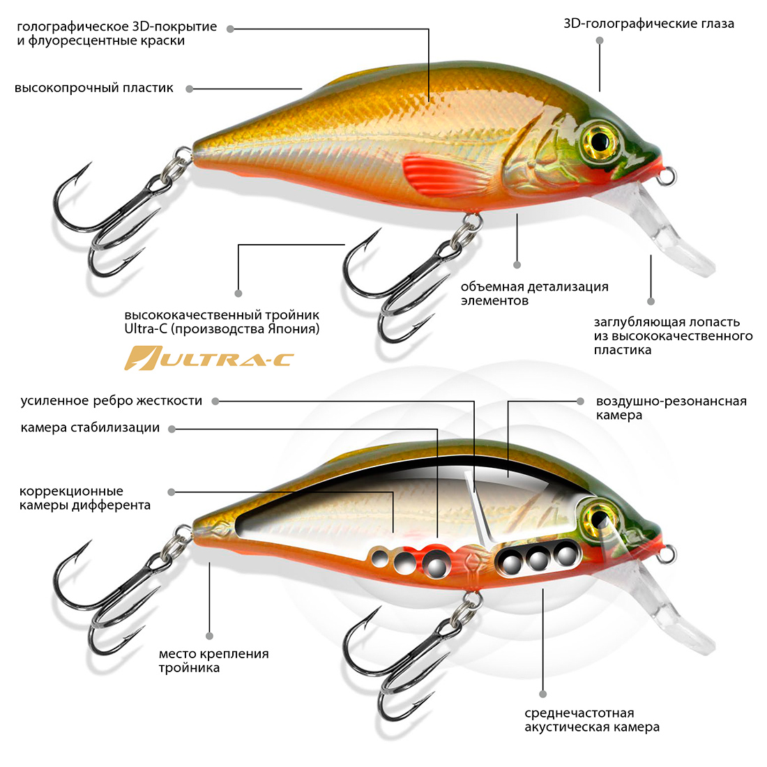 Корпус воблера и заглубляющая лопасть (язычок) изготовлены из ударопрочного пластика неподвластного зубам хищной рыбы и выдерживающая удары о донные камни при проводке.