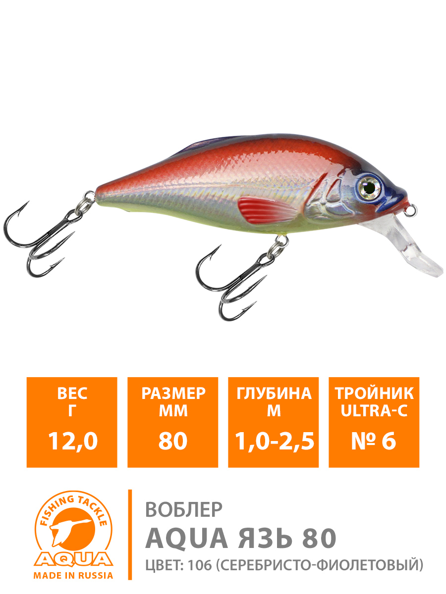 Воблер Aqua Язь плавающий 80мм 12гр 1-2,5м цвет 106 (серебристый, фиолетовый)
