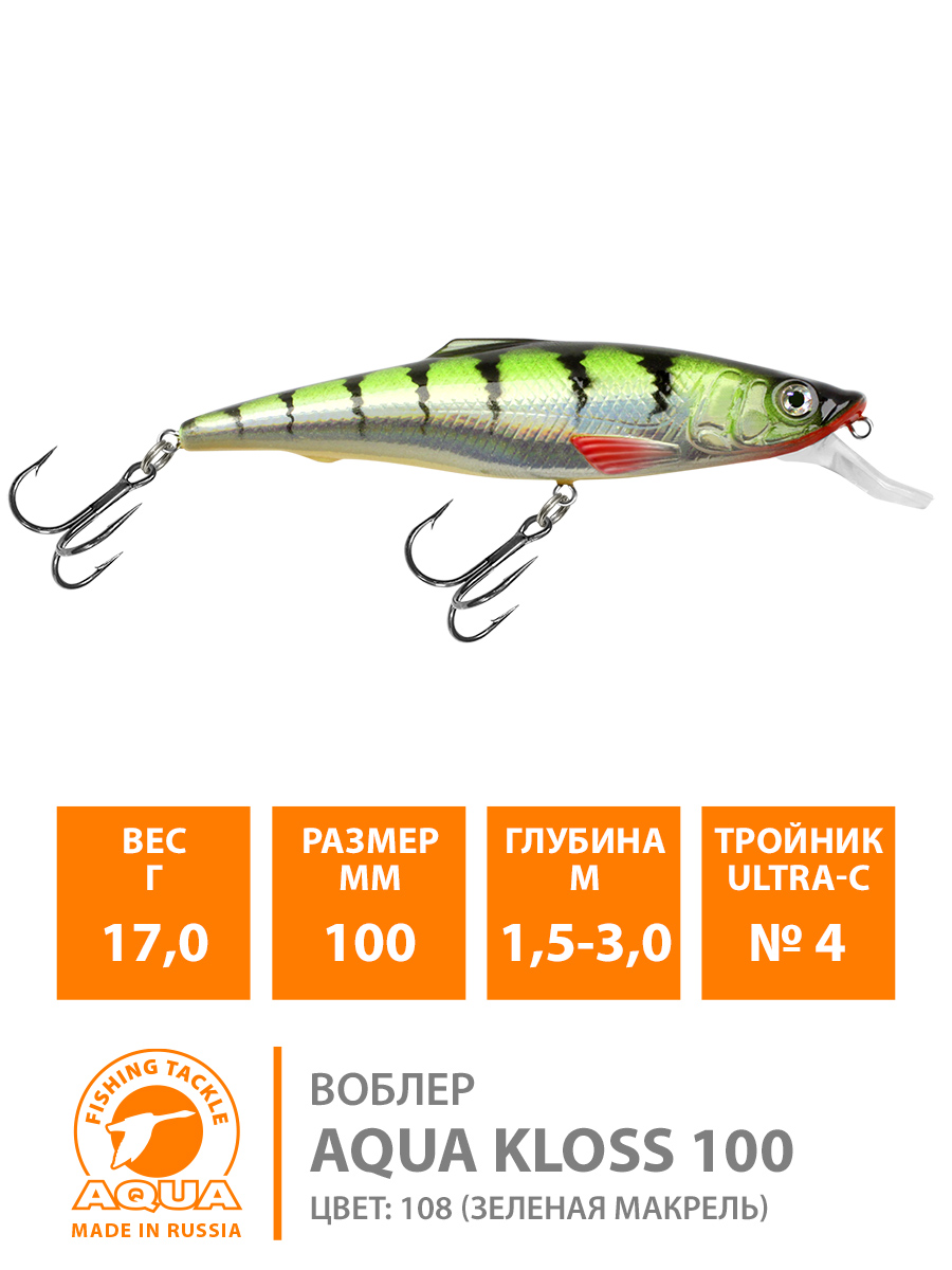 Воблер Aqua Kloss плавающий 100мм 17гр 1,5-3м цвет 108 (зеленая макрель)