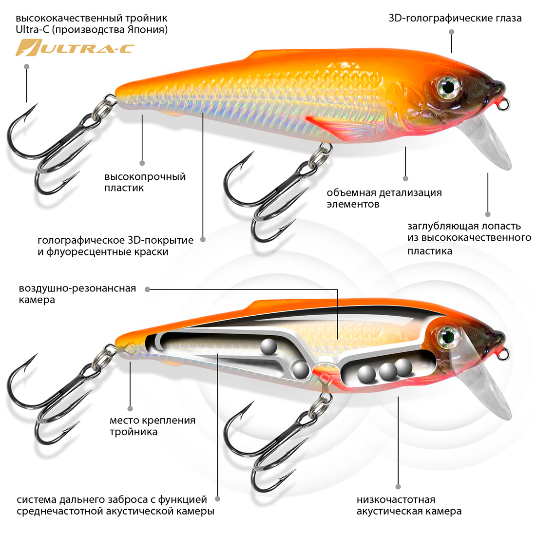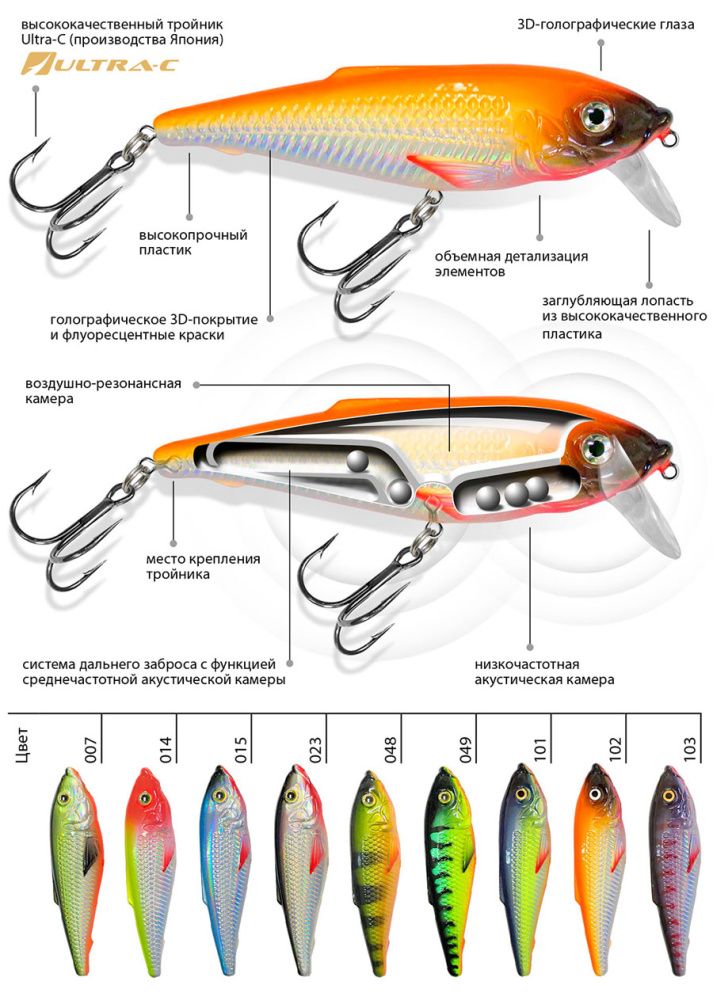 Корпус воблера и заглубляющая лопасть (язычок) изготовлены из ударопрочного пластика неподвластного зубам хищной рыбы и выдерживающая удары о донные камни при проводке.
