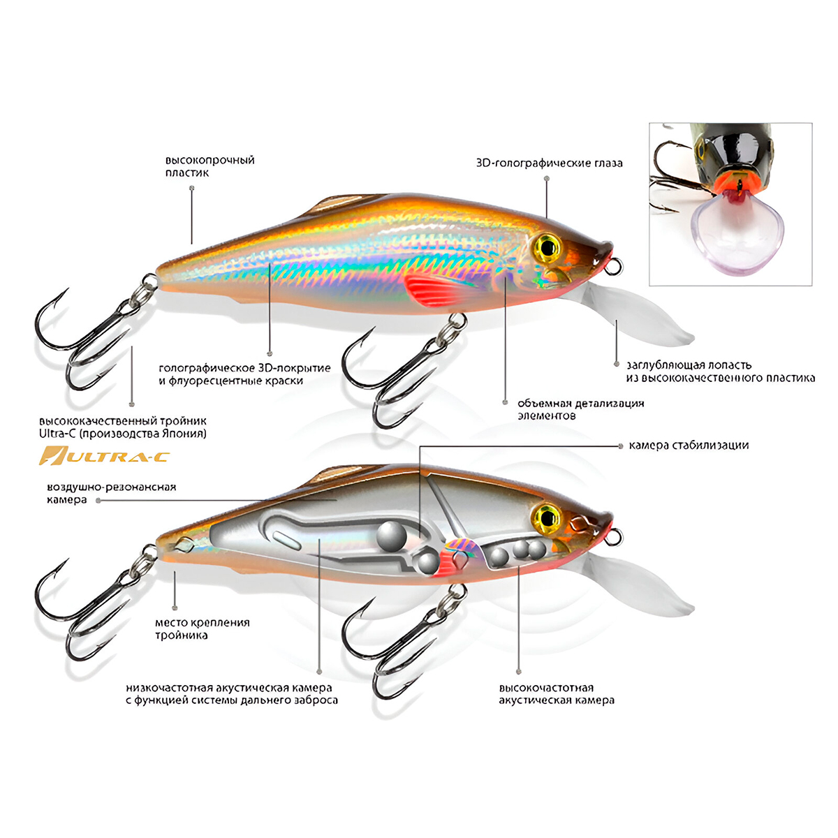 Внутри Burnash «в свободном полете» находятся металлические шарики, стабилизирующие игру приманки, создающие шумовой эффект и многократно увеличивающие дальность заброса. Воблер Burnash наиболее эффективен на глубинах от 1,5m до 3,5m.