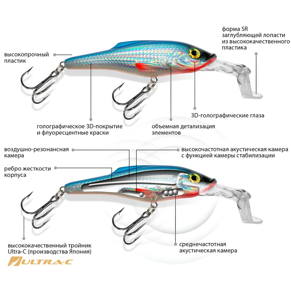 Заглубляющая носовая лопасть оригинальной формы, выдерживающая удары о донные камни при проводке, позволяет воблеру максимально быстро достигнуть заданной глубины, что важно при не очень дальних забросах.