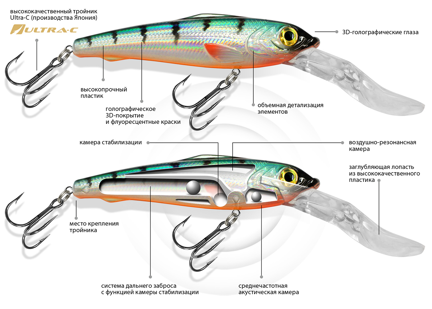 Усиленный корпус приманки с ребрами жесткости уверено противостоит зубам любого хищника «покусившегося» на уловистый воблер.