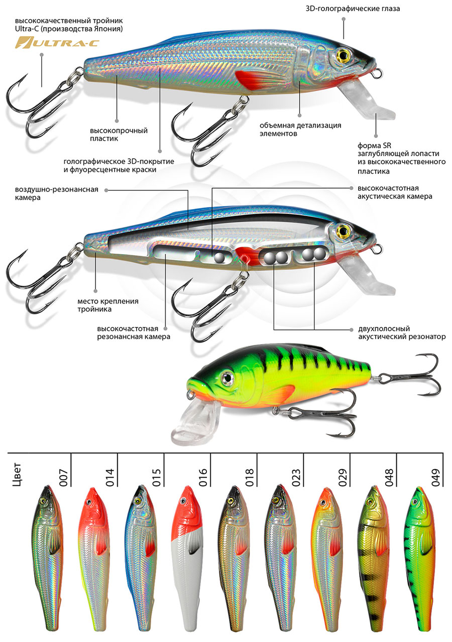 Тайна уникальной уловистости данного воблера заключается в удачно выбранной форме, близкой к живой рыбке и активная устойчивая игра. Меняются технологи – простой рисунок чешуи, нанесенный на алюминиевую фольгу, сменился двунаправленной 3D чешуей, покрытой светоотражающим покрытием с эффектом «разбрызгивания света» или имитацией отлетающих чешуек, вместо нарисованных глаз появились увеличенные, слегка выпуклые 3D глаза, которые дополнительно провоцируют хищника на атаку, давая ему так называемую, «точку прицеливания».