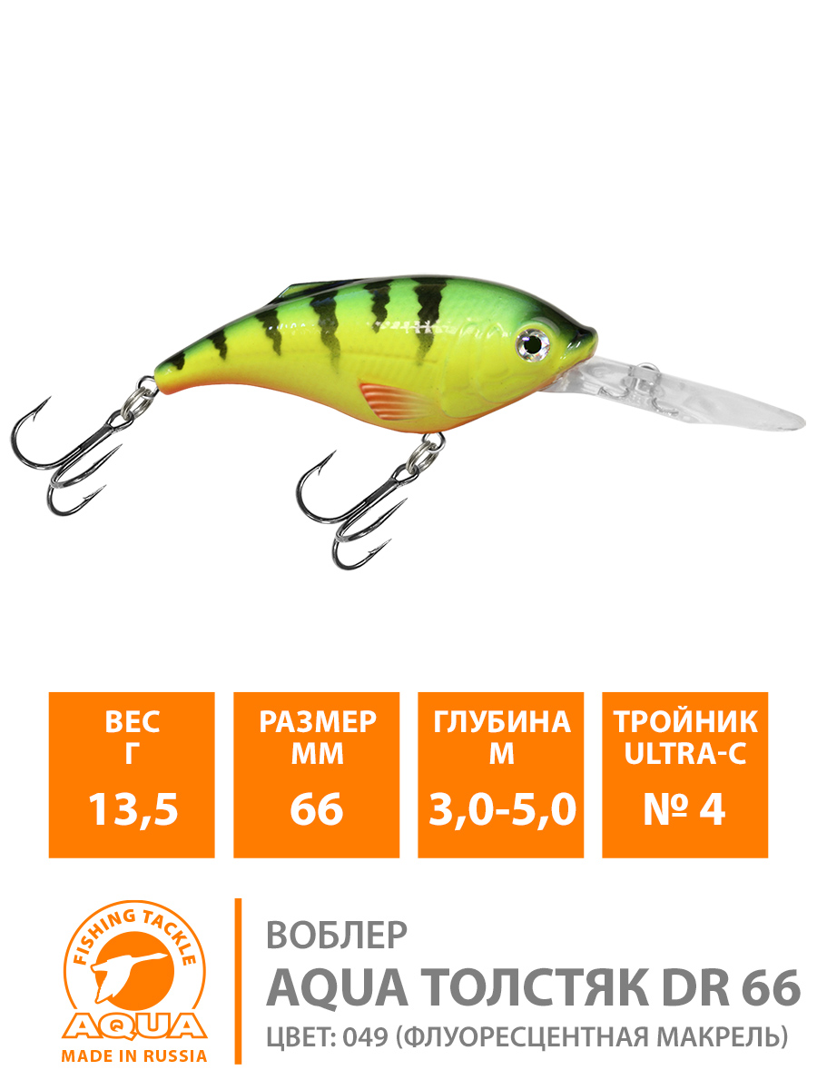 Воблер Aqua Толстяк DR плавающий 66мм 13,5гр 3-5м цвет 049 (флуоресцентная макрель)