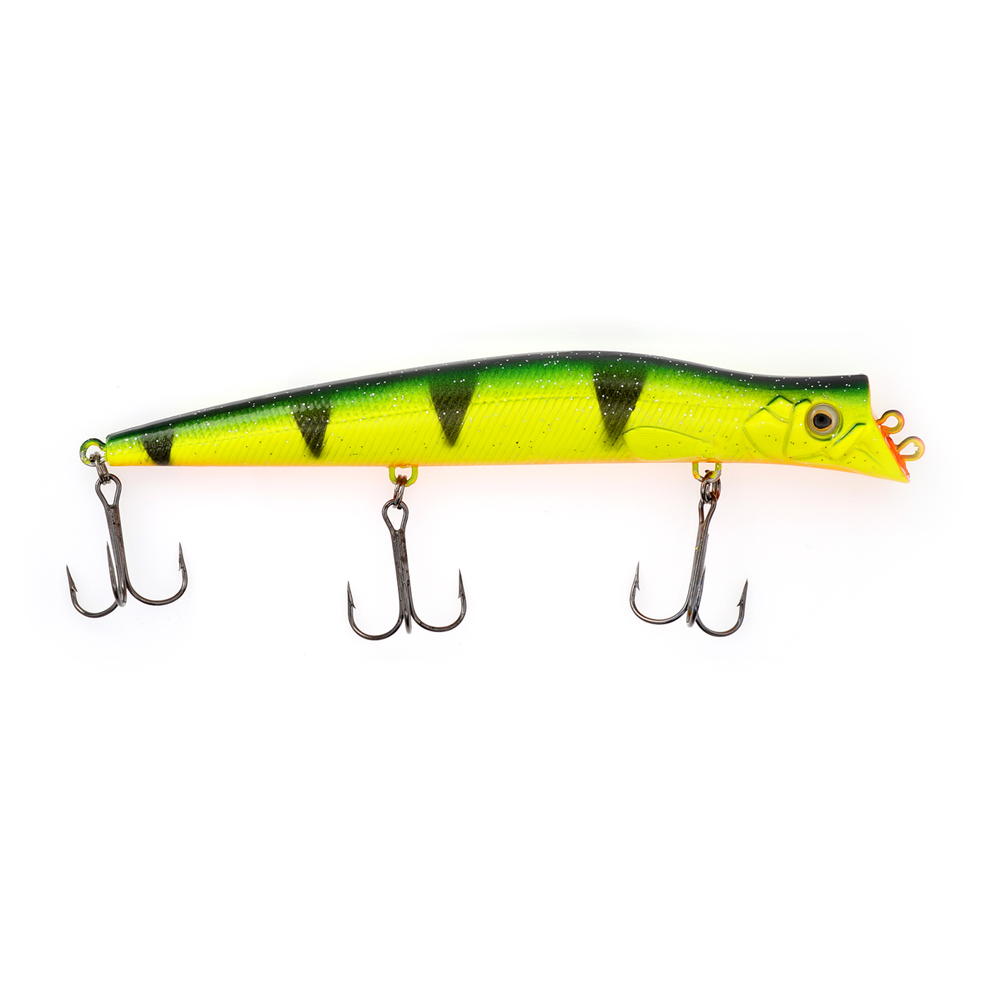 Если леску закрепить за нижнюю петельку, воблер меняет игру и идет под самой поверхностью. Воблер начинает играть более амплитудно с осевыми доворотами корпуса, привлекательно двигаясь даже на самых медленных скоростях проводки.