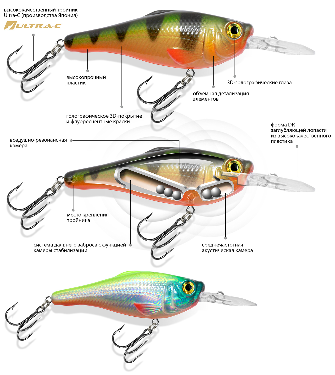 Корпус воблера и заглубляющая лопасть (язычок) изготовлены из ударопрочного пластика неподвластного зубам хищной рыбы и выдерживающая удары о донные камни при проводке.