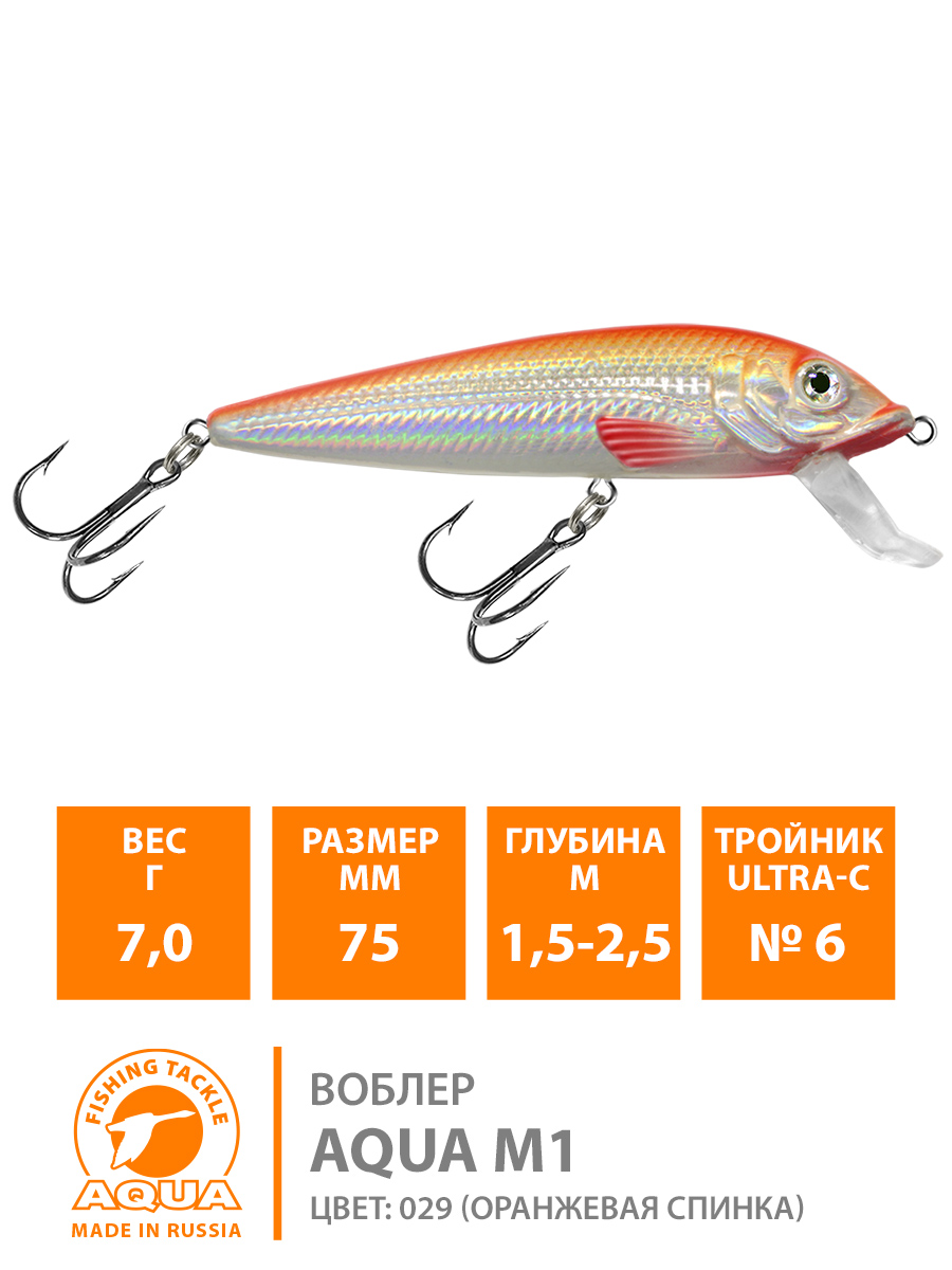 Воблер Aqua M-1 (new) тонущий 75мм 7гр 1,5-2,5м цвет 029 (оранжевая спинка)