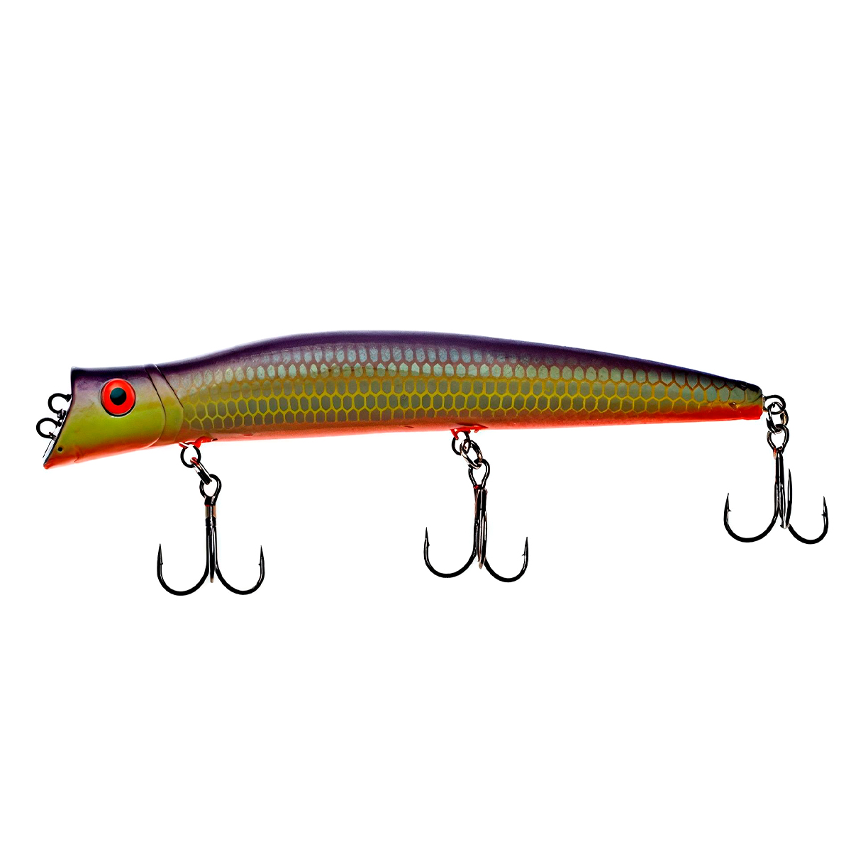 Если леску закрепить за нижнюю петельку, воблер меняет игру и идет под самой поверхностью. Воблер начинает играть более амплитудно с осевыми доворотами корпуса, привлекательно двигаясь даже на самых медленных скоростях проводки.