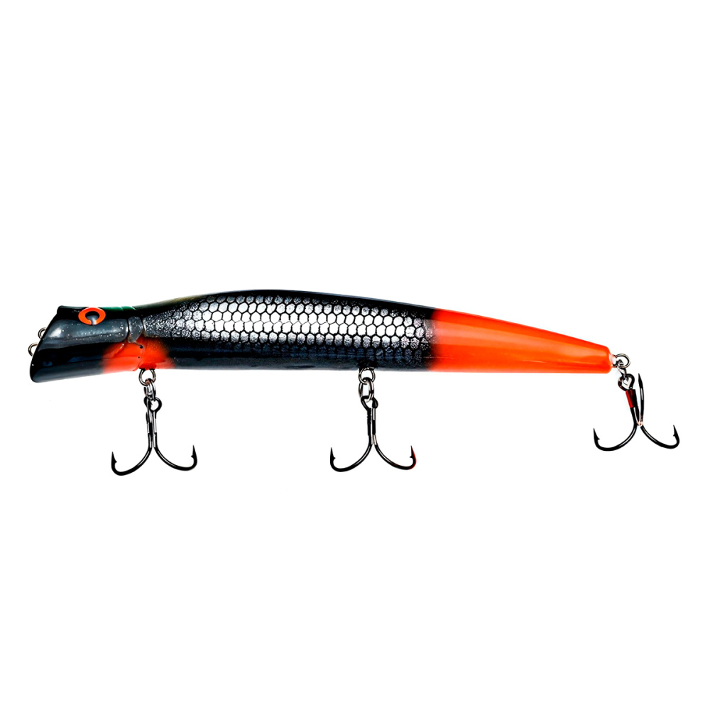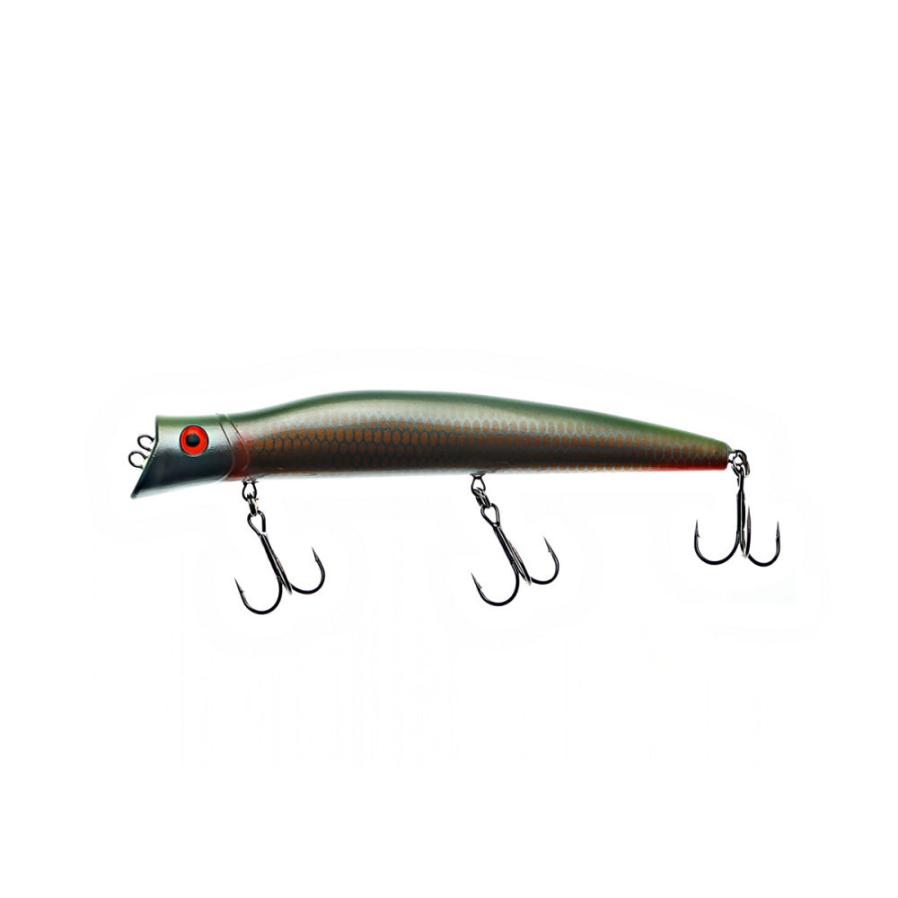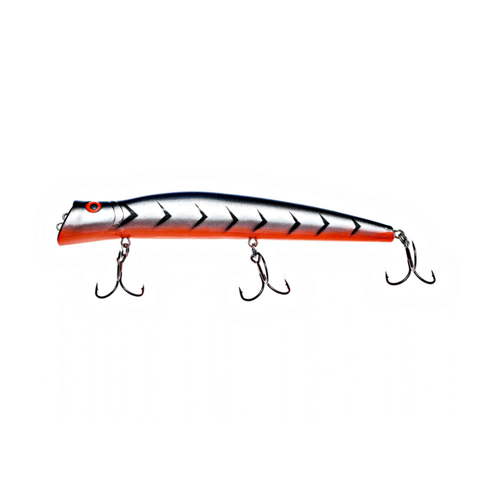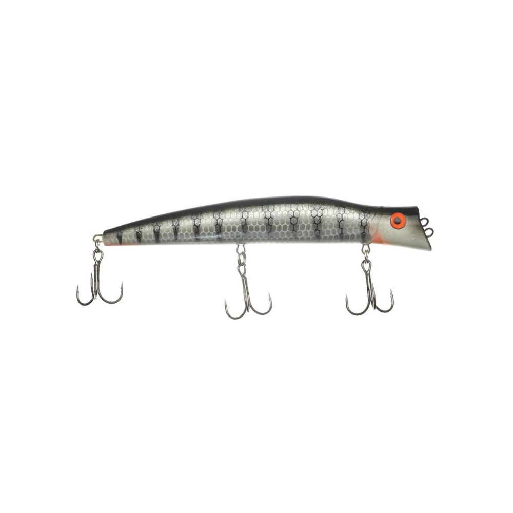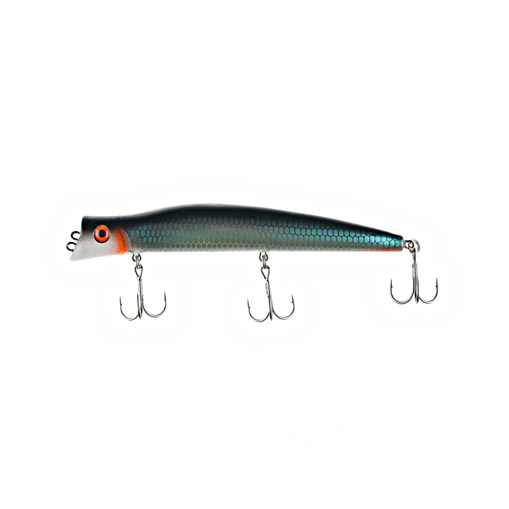 Если леску закрепить за нижнюю петельку, воблер меняет игру и идет под самой поверхностью. Воблер начинает играть более амплитудно с осевыми доворотами корпуса, привлекательно двигаясь даже на самых медленных скоростях проводки.