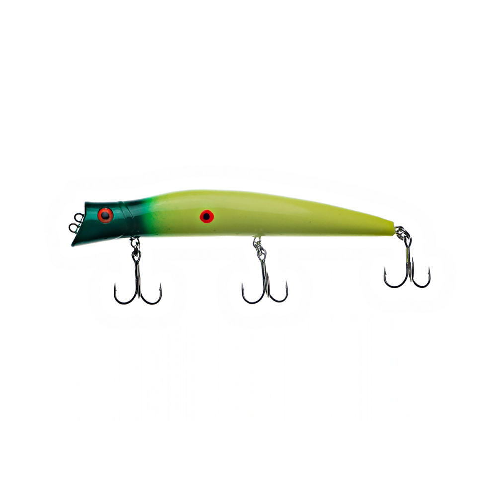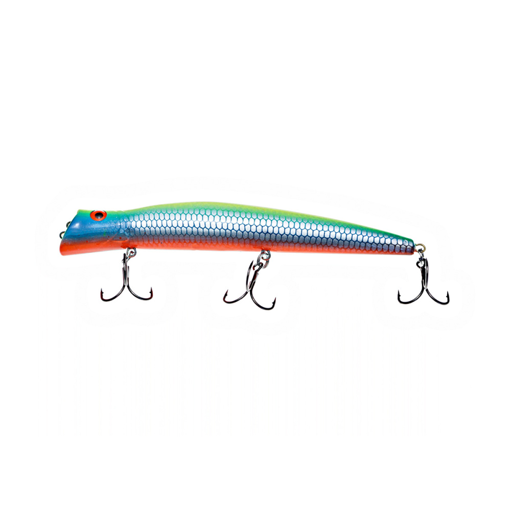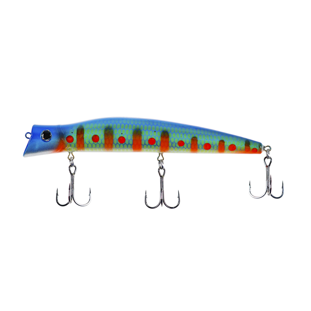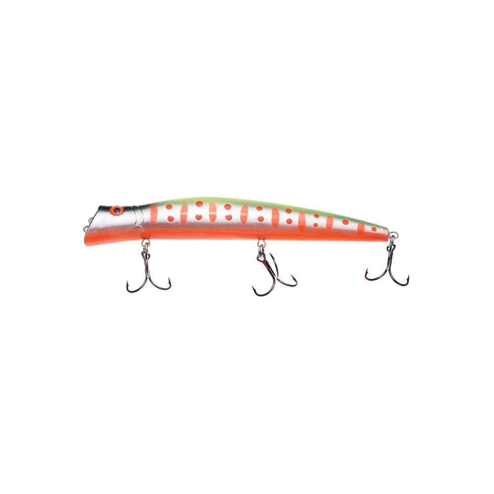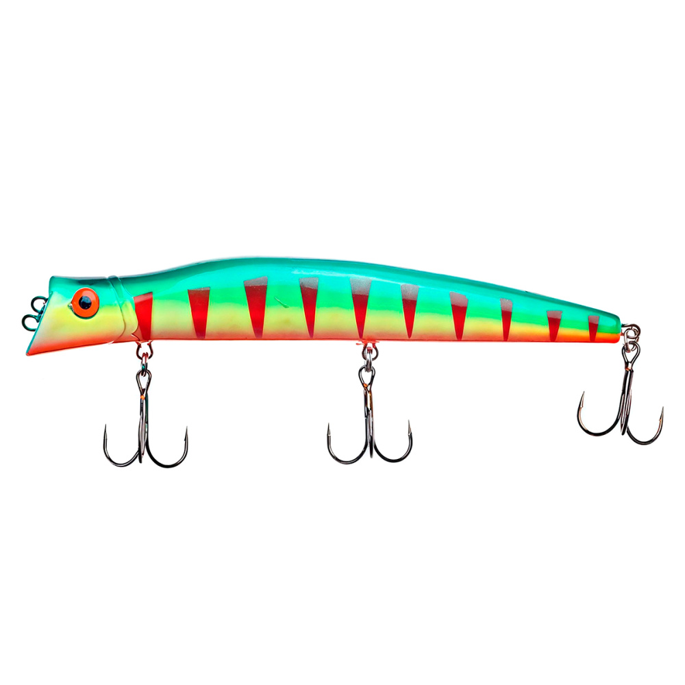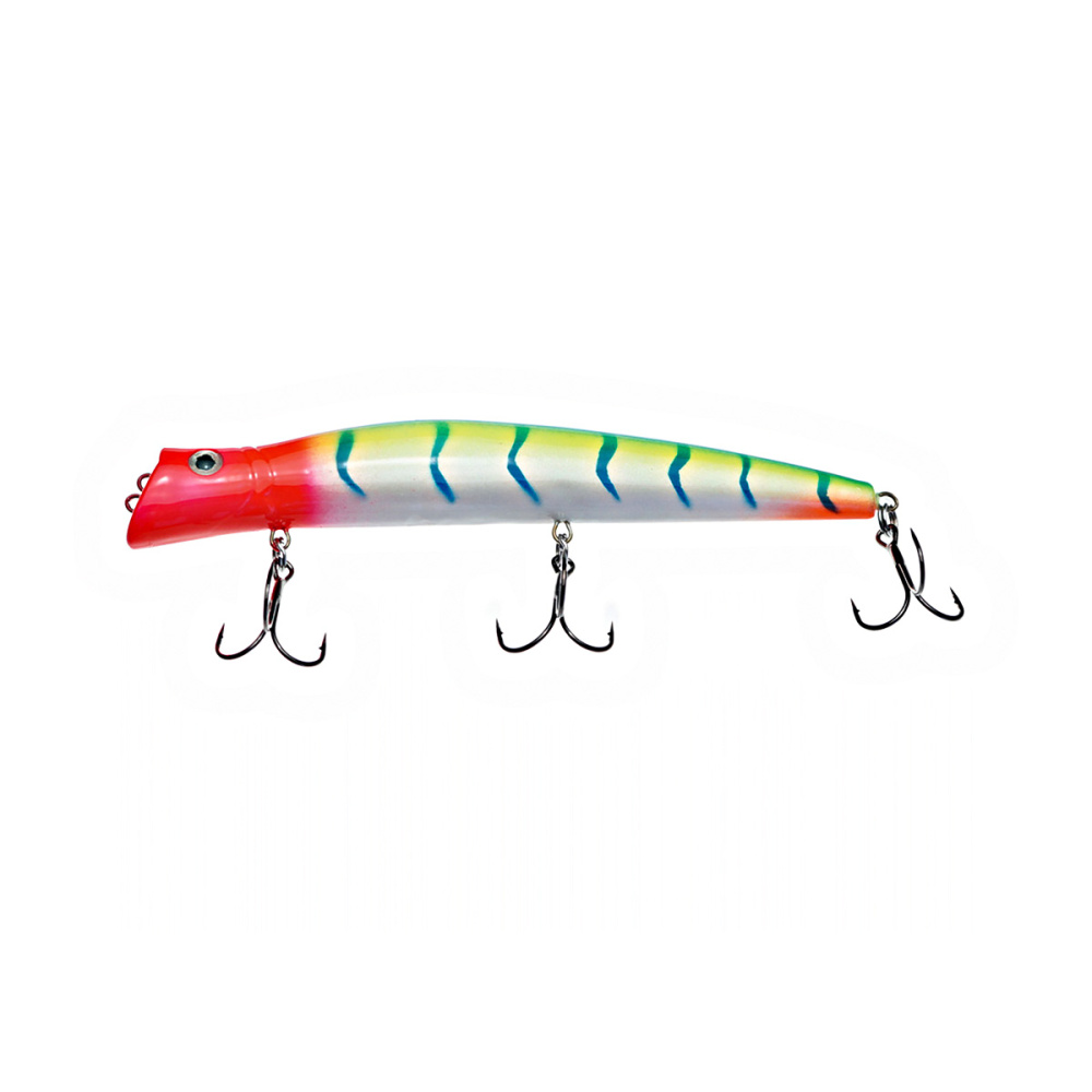 Если леску закрепить за нижнюю петельку, воблер меняет игру и идет под самой поверхностью. Воблер начинает играть более амплитудно с осевыми доворотами корпуса, привлекательно двигаясь даже на самых медленных скоростях проводки.