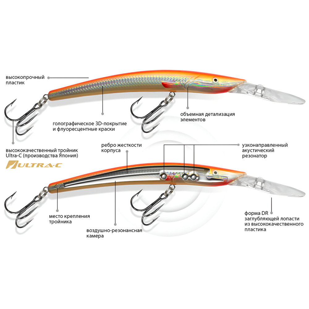 Корпус воблера и заглубляющая лопасть (язычок) изготовлены из ударопрочного пластика неподвластного зубам хищной рыбы и выдерживающая удары о донные камни при проводке.