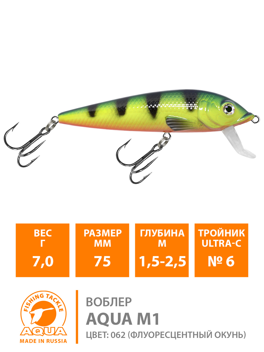 Воблер Aqua M-1 (new) тонущий 75мм 7гр 1,5-2,5м цвет 062 (флуоресцентный Окунь)