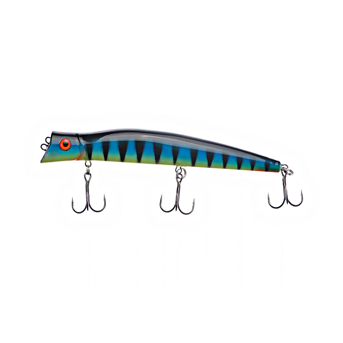 Если леску закрепить за нижнюю петельку, воблер меняет игру и идет под самой поверхностью. Воблер начинает играть более амплитудно с осевыми доворотами корпуса, привлекательно двигаясь даже на самых медленных скоростях проводки.