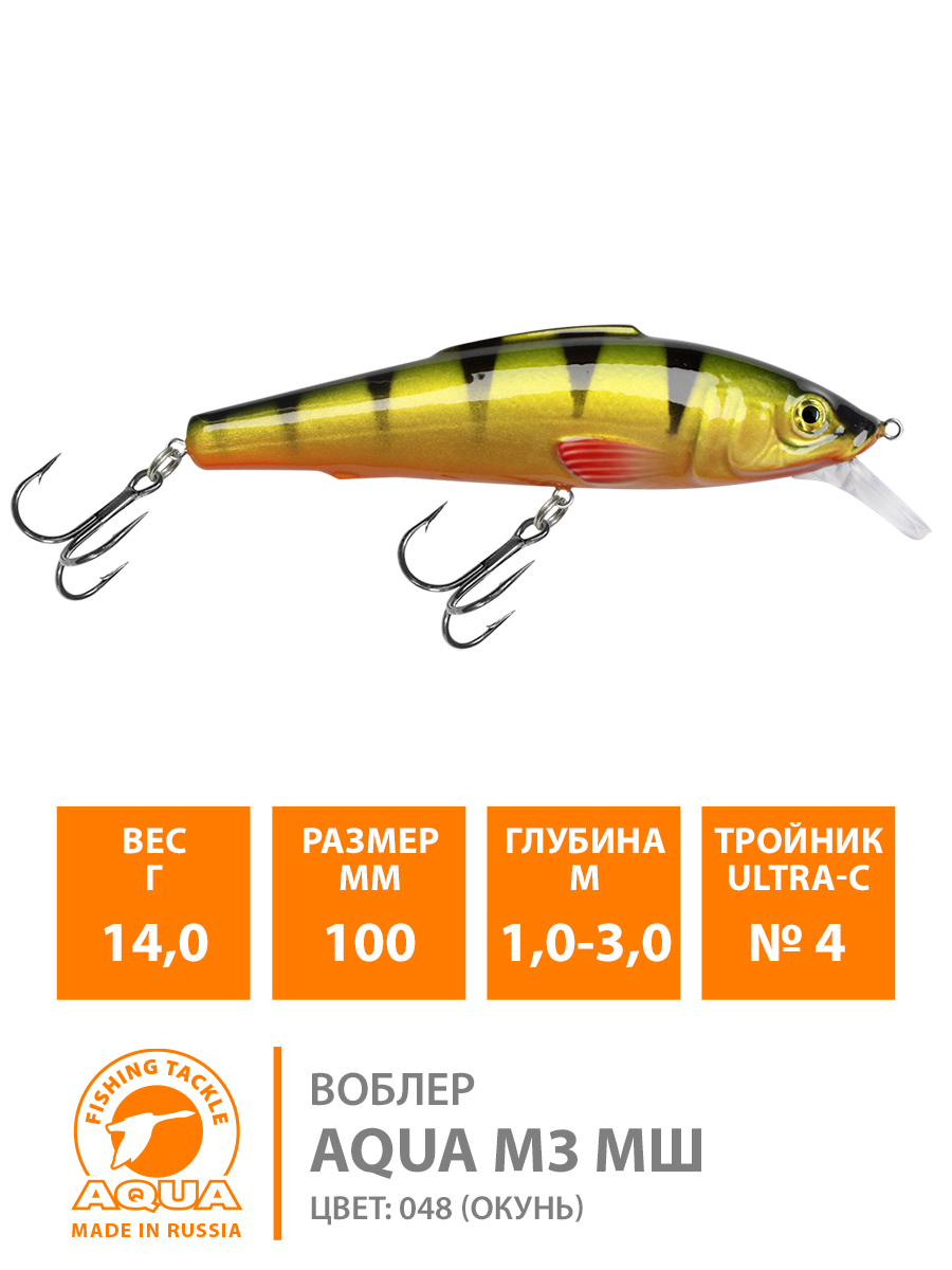 Воблер Aqua M-3-МШ плавающий 100мм 14гр 1-3м цвет 048 (Окунь)