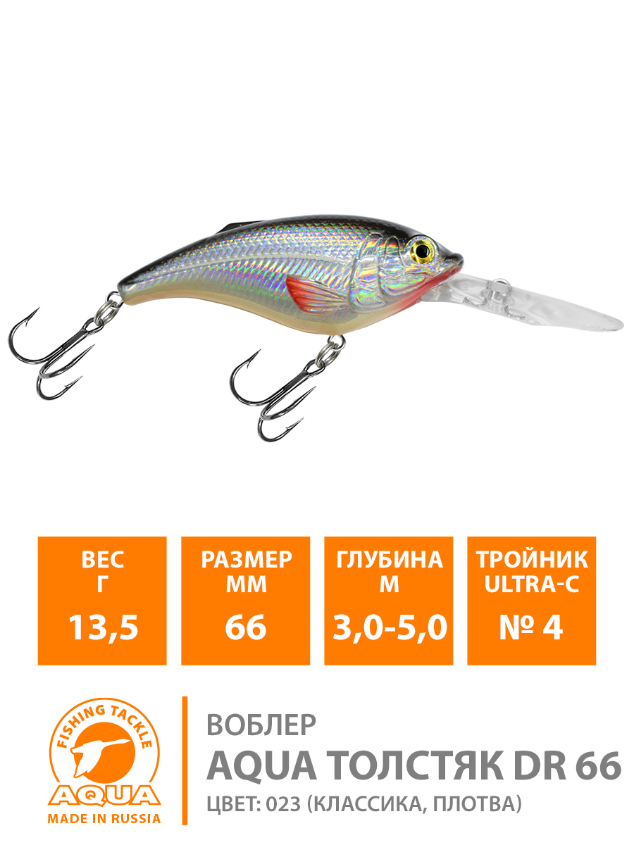 Воблер Aqua Толстяк DR плавающий 66мм 13,5гр 3-5м цвет 023 (классика, Плотва)