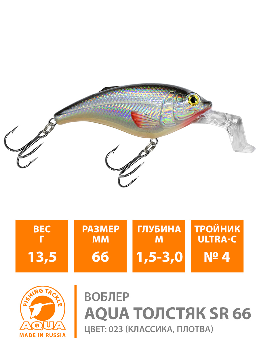 Воблер Aqua Толстяк SR плавающий 66мм 13,5гр 1,5-3м цвет 023 (классика, Плотва)
