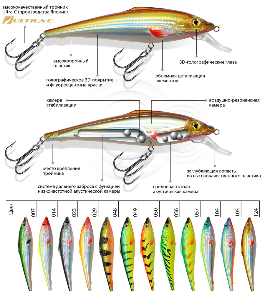 Игра воблера остается стабильной благодаря тщательно выверенной огрузке балластными шариками камеры стабилизации, что не дает воблеру заваливаться при медленной или рывковой проводке. Металлические шарики, расположенные внутри корпуса, во время заброса располагаются в хвостовой части, обеспечивая дальний и точный заброс.