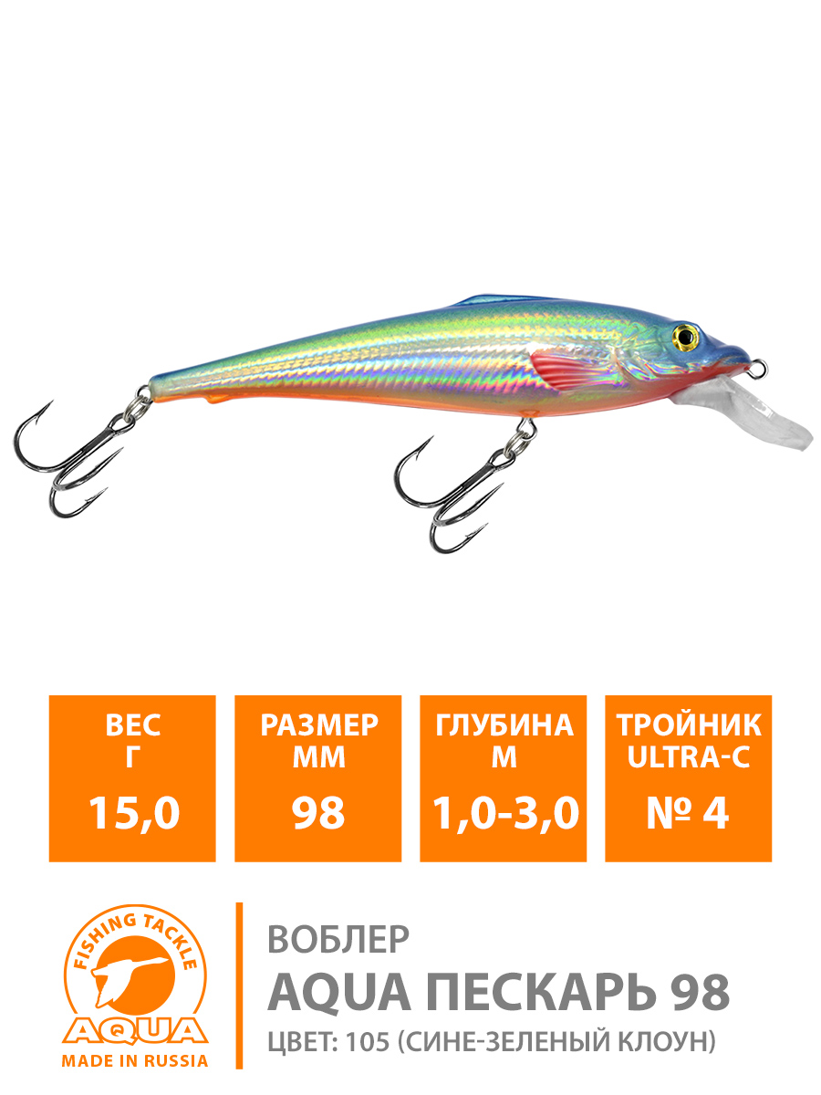 Воблер Aqua Пескарь плавающий 98мм 15гр 1-3м цвет 105 (зеленый, оранжевый клоун)