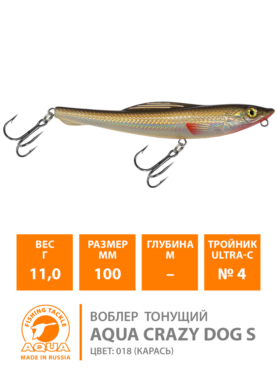 Воблер Aqua Crazy Dog Sinking тонущий 100мм 11гр до 0,5м цвет 018 (Карась)