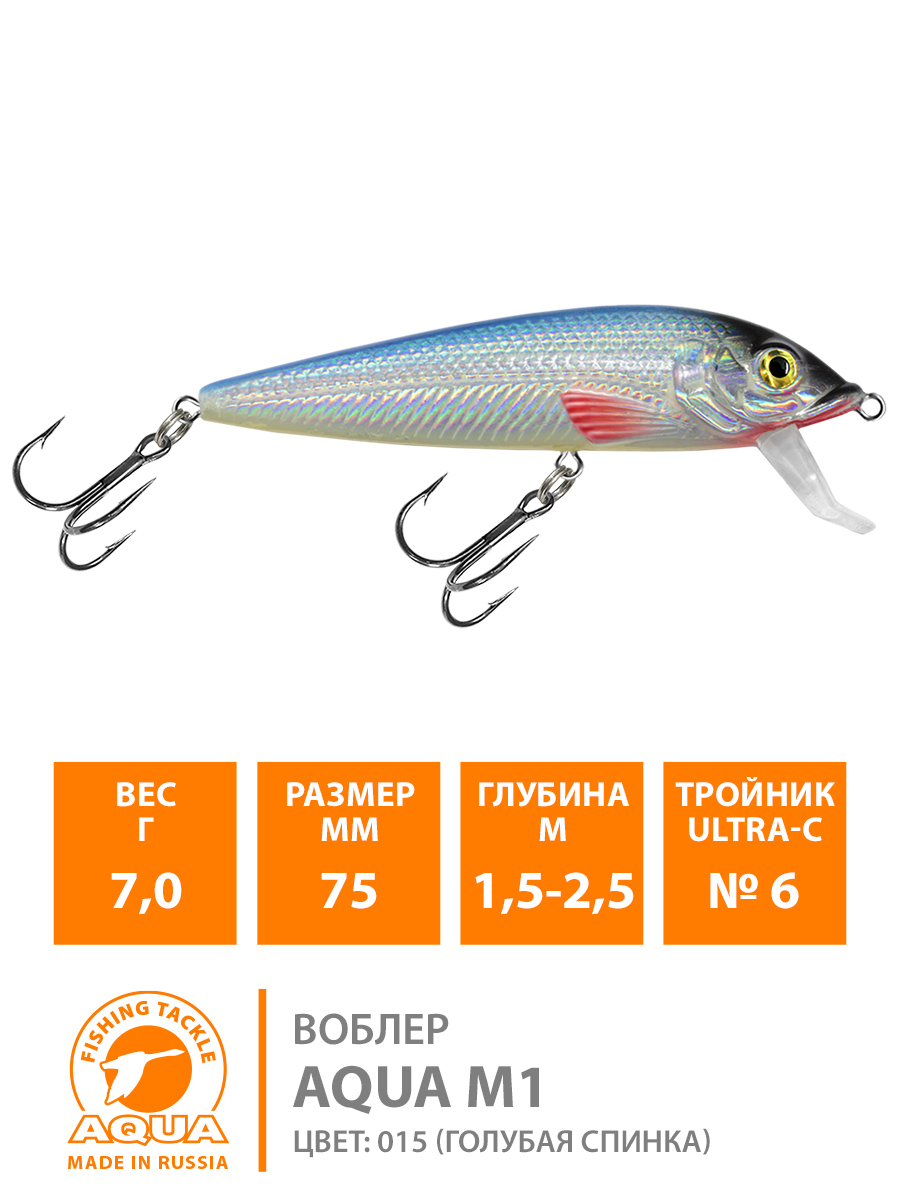Воблер Aqua M-1 (new) тонущий 75мм 7гр 1,5-2,5м цвет 015 (голубая спинка)