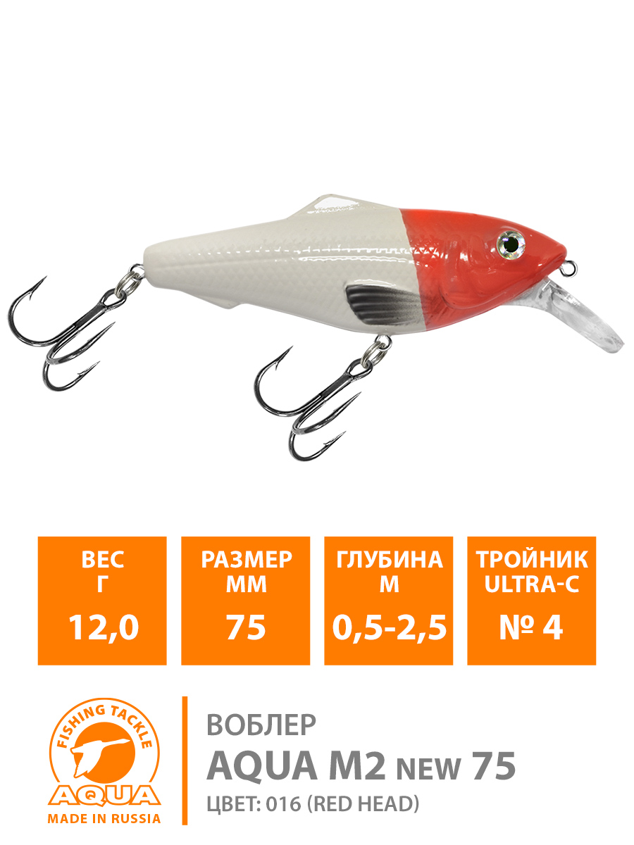 Воблер Aqua M-2 (new) плавающий 75мм 12гр 0,5-2,5м цвет 016 (red head)
