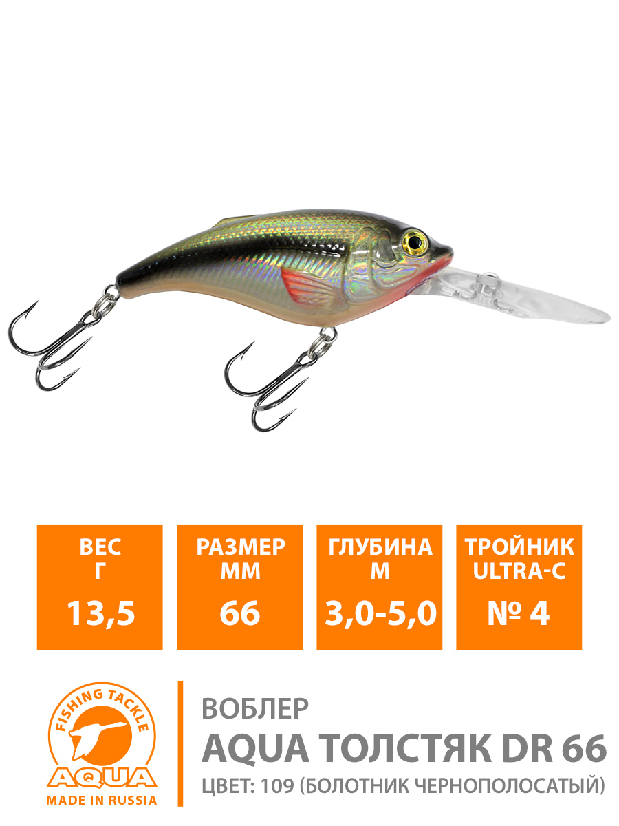 Воблер Aqua Толстяк DR плавающий 66мм 13,5гр 3-5м цвет 109 (болотник чернополосатый)