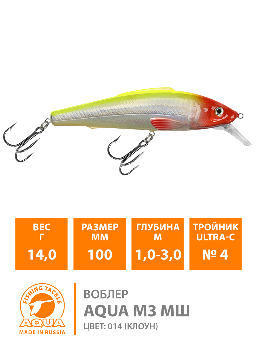 Воблер Aqua M-3-МШ плавающий 100мм 14гр 1-3м цвет 014 (клоун)