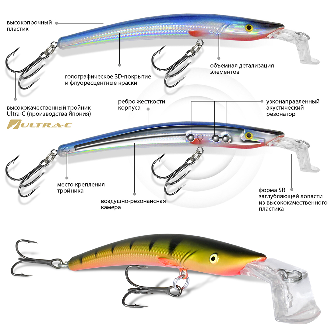 Мощная заглубляющая лопасть оригинальной формы не только быстро уводит приманку на рабочую глубину, но и с легкостью выдерживает и удары о камни при проводке и мощнейшие поклевки трофейной рыбы.