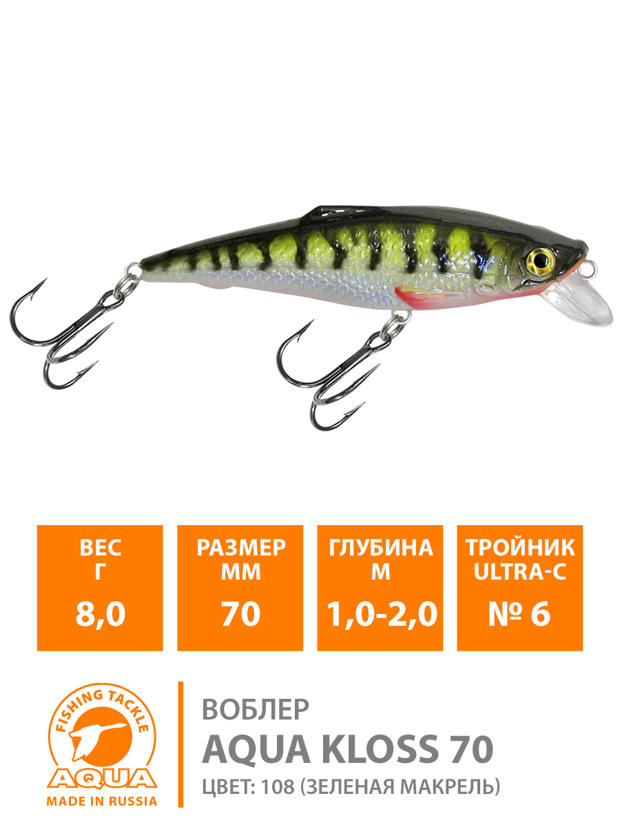 Воблер Aqua Kloss плавающий 70мм 8гр 1-2м цвет 108 (зеленая макрель)