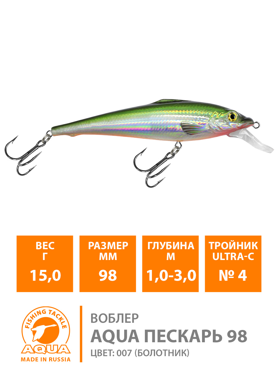 Воблер Aqua Пескарь плавающий 98мм 15гр 1-3м цвет 007 (болотник)