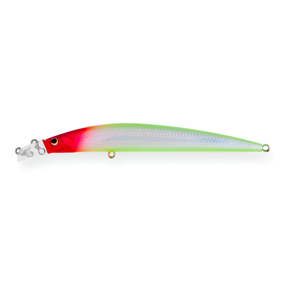Конструктивной особенностью воблеров Strike Pro Top Water Minnow 110 служит лопатка особой конструкции, в которой расположены сразу две петли для лески. Таким образом, при закреплении лески за нижнюю петельку, приманка идет под самой поверхностью на глубине от 0,2до 0,3 м, за верхнюю - воблер опускается на глубину до 0,7 м.