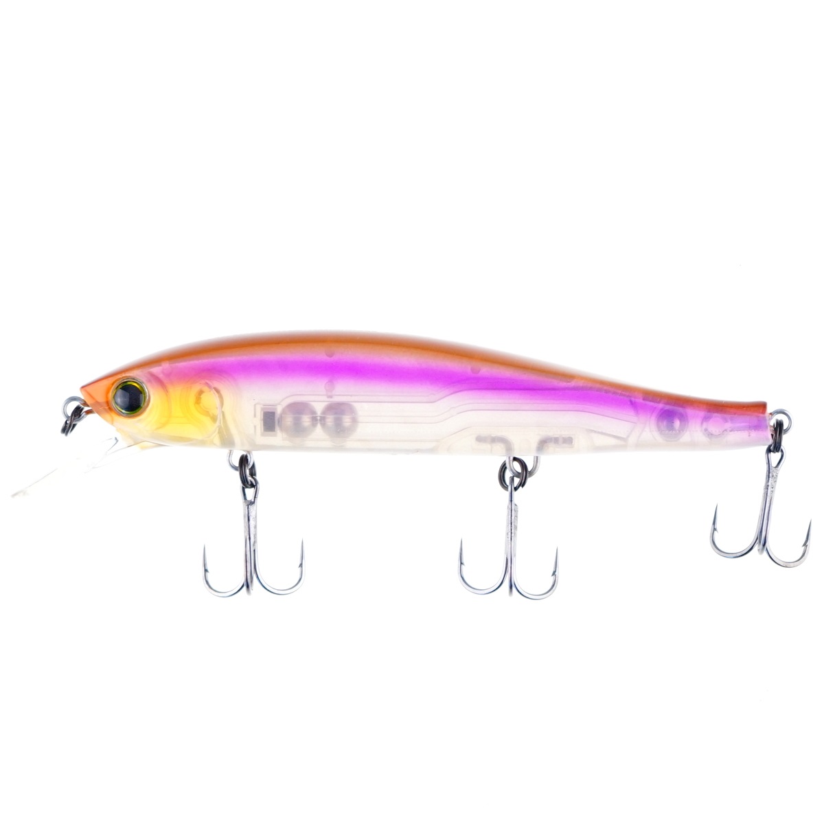 Внутри используется New Magnetic Weight Transfer: шар перемещается к хвосту при забросе для дистанции, а в проводке фиксируется, повышая отзывчивость на твич и стабилизацию на равномерке. Triple Mirror Body добавляет многогранные блики, заметные даже в мутной воде и при рассеянном свете. Цвет GSWS («Ghost Wakasagi/Smelt») имитирует ускользающего усача/снетка и работает круглый сезон.