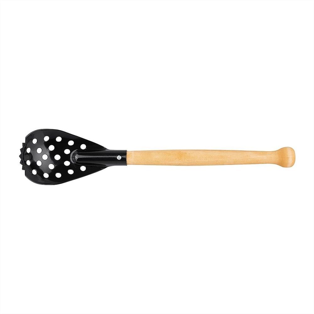 Ручка черпака изготовлена из березы, покрыта специальным защитно-декоративным составом и имеет удобную форму, предотвращающую выскальзывание черпака из рук. Ручка крепится к ложке при помощи шурупа.