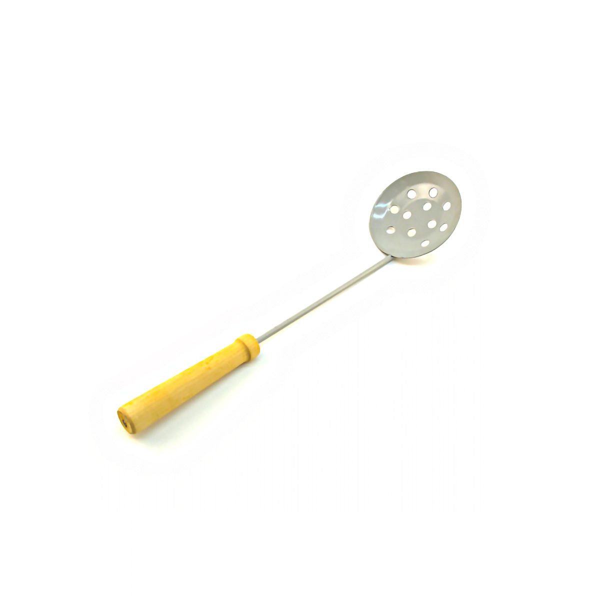 Ложка черпака имеет вид шумовки, изготовлена из стали, дополнительно окрашена полимерной порошковой краской.