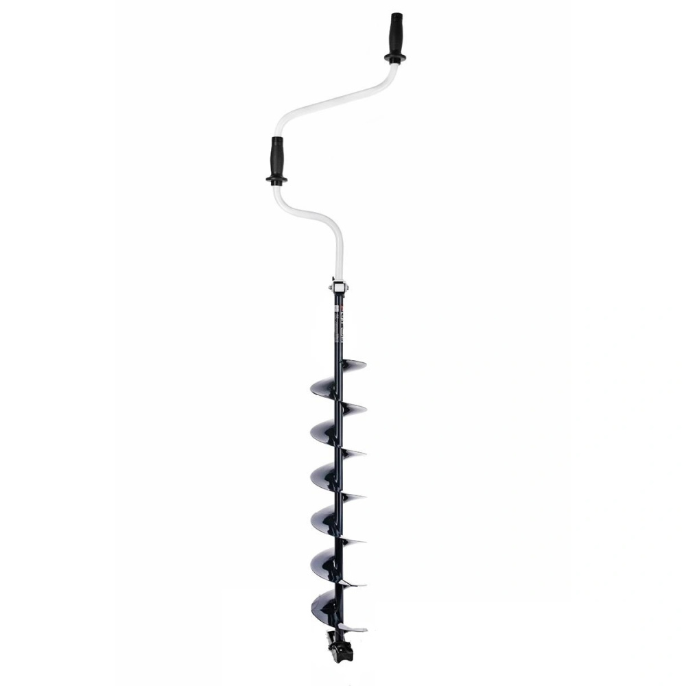 Рабочее вращение - левое (против часовой стрелки).Верхняя рукоятка ледобура смещена относительно оси шнека на 130 мм, а нижняя на 150 мм. Такое расположение рукояток позволяет вращать ледобур одновременно двумя руками, тем самым, не прикладывая особых усилий, увеличивая скорость бурения лунок во льду.