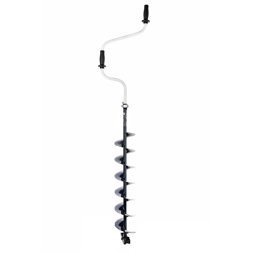 Верхняя рукоятка ледобура смещена относительно оси шнека на 130 мм, а нижняя на 150 мм. Такое расположение рукояток позволяет вращать ледобур одновременно двумя руками, тем самым, не прикладывая особых усилий, увеличивая скорость бурения лунок во льду.