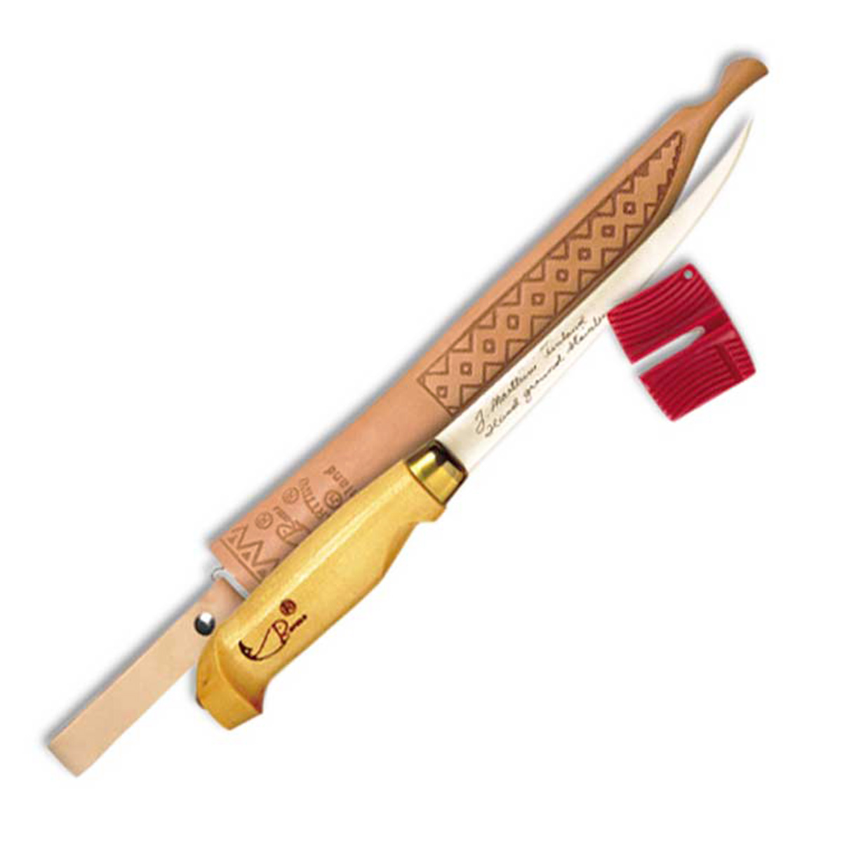 Классика от финских мастеров Marttiini Лезвие из шведской стали Sandvik 12C27 с зеркальной полировкой держит бритвенную остроту, а твёрдость 54–56 HRC балансирует износостойкость и простоту правки в выездных условиях. Рукоять — лакированная скандинавская берёза с латунной гардой и фиксирующим Safety Notch. В комплекте тиснёные кожаные ножны и одноступенчатая точилка — всё, что нужно прямо из коробки.